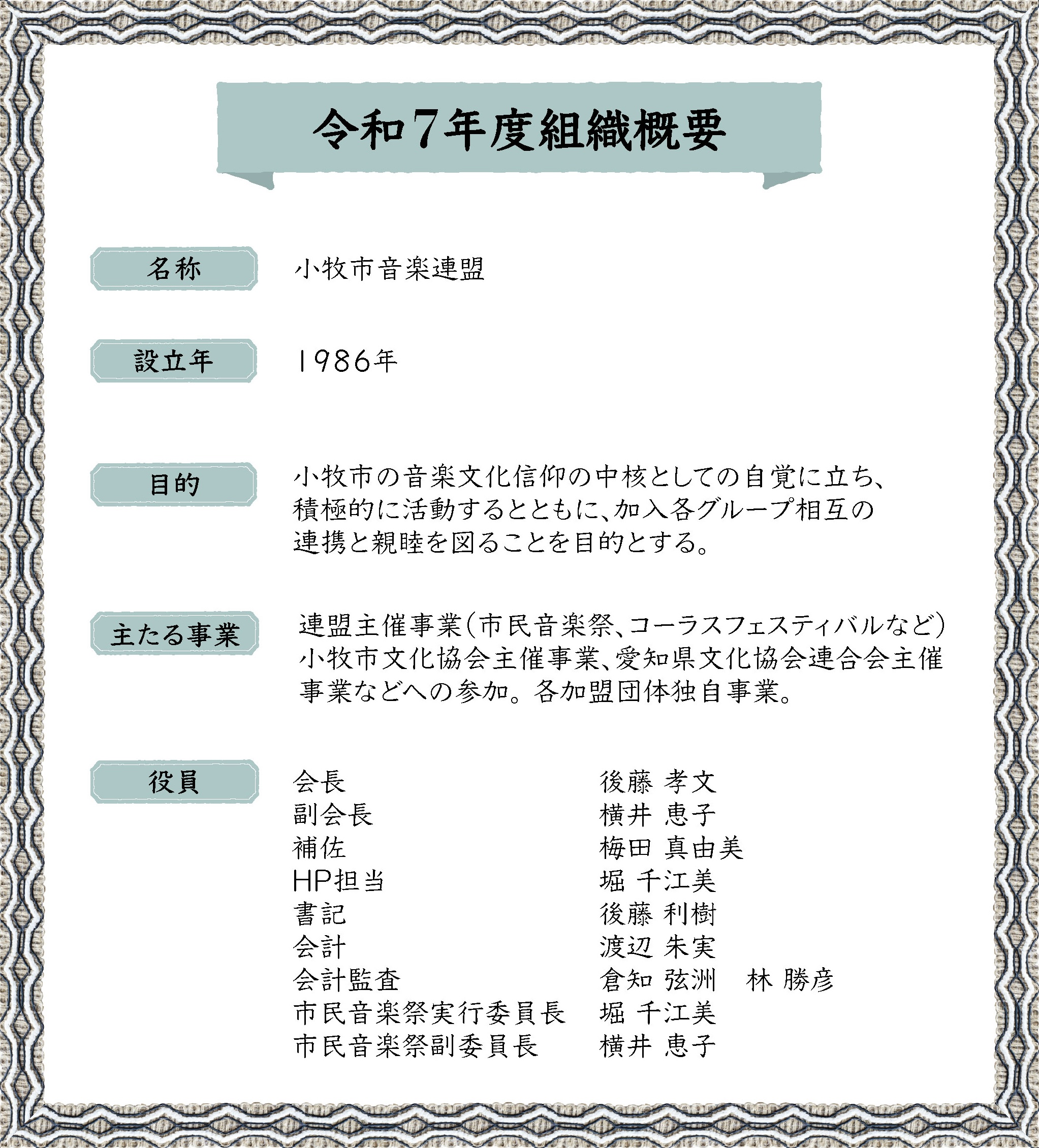 小牧市音楽連盟は、1986年に設立し、現在では16団体約230名が参加しています。器楽5団体、合唱11団体で構成。